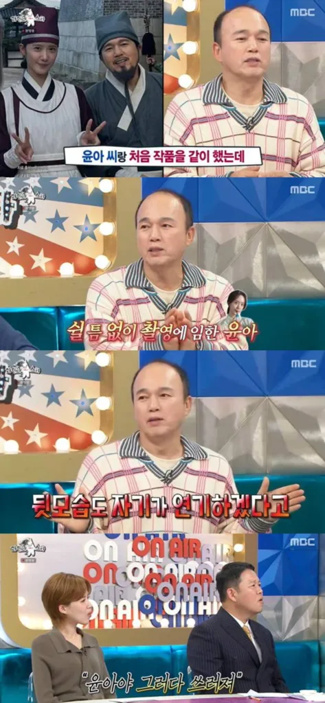 “นี่เป็นครั้งแรกที่ผมได้ร่วมงานกับยุนอา ในละครพีเรียดเราจะเริ่มถ่ายตั้งแต่หกโมงเช้าจนกว่าจะพระอาทิตย์ตก ปกติพระเอกนางเอกจะมาถึงก่อนประมาณสามชั่วโมงเพื่อเตรียมตัว และส่วนใหญ่จะพักบ้างเพื่อรักษาสภาพร่างกาย แต่ยุนอาทำงานอย่างจริงจังและเป็นแบบอย่างที่ดีมาก ผมชอบใช้สตันต์นะ แต่ยุนอาเล่นเองหมดเลย ทั้งฉากทำอาหารหรือแม้แต่ฉากที่เห็นแค่ด้านหลัง”